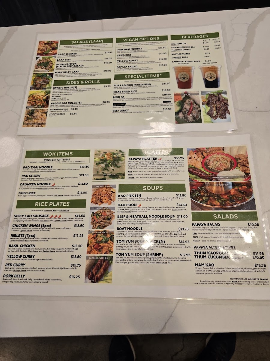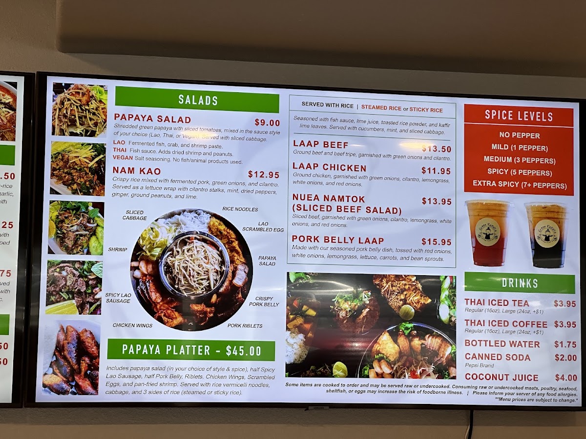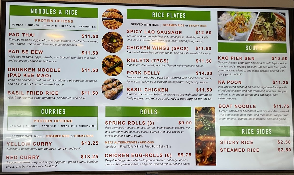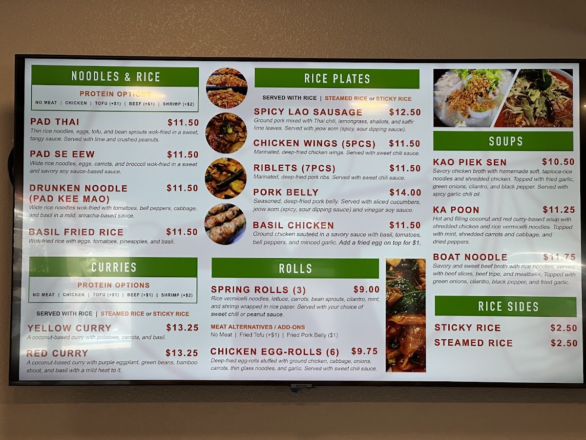 This menu serves well for lunch or dinner occasions and accommodates both dine-in and takeout preferences. It offers a broad range of authentic dishes that highlight both Thai and Laotian culinary influences.