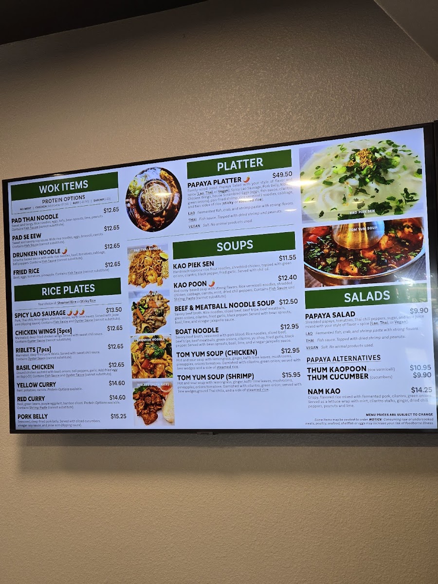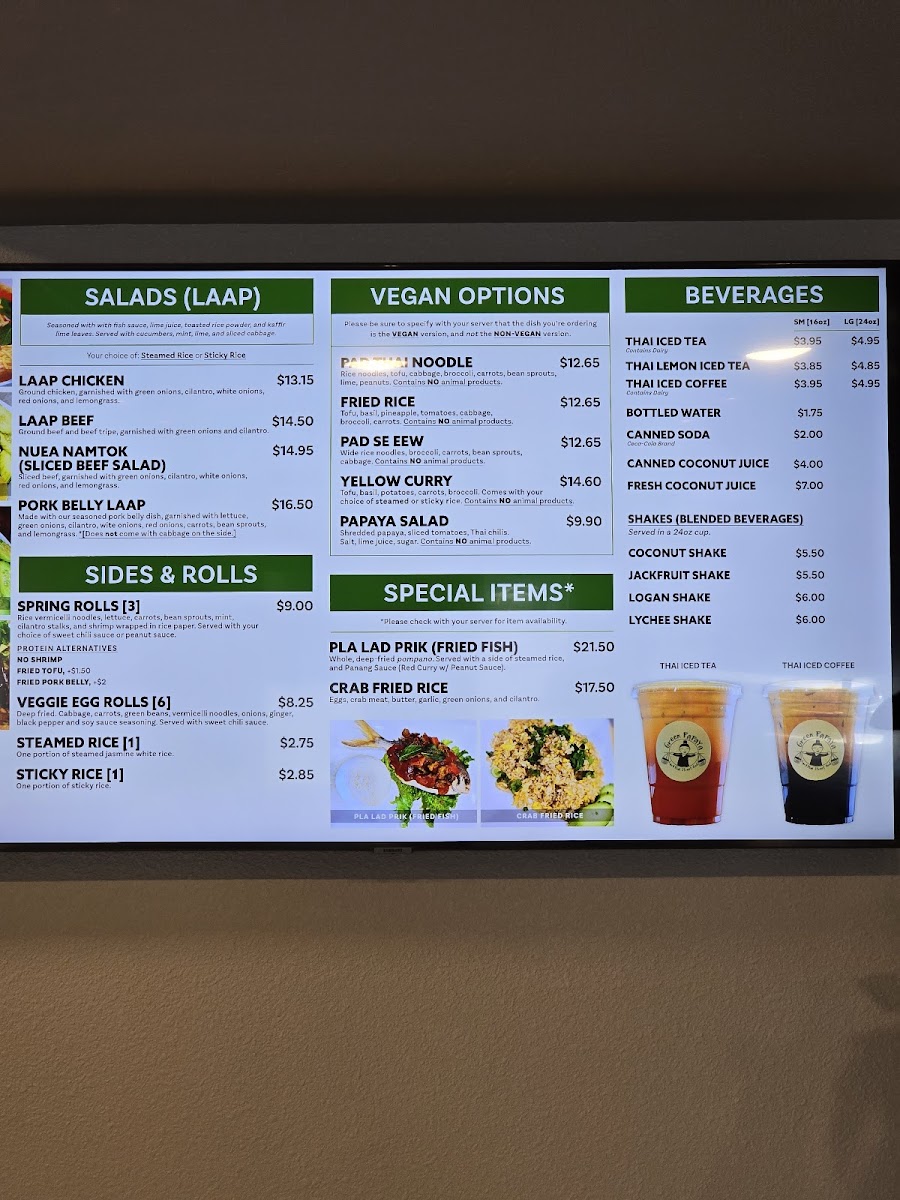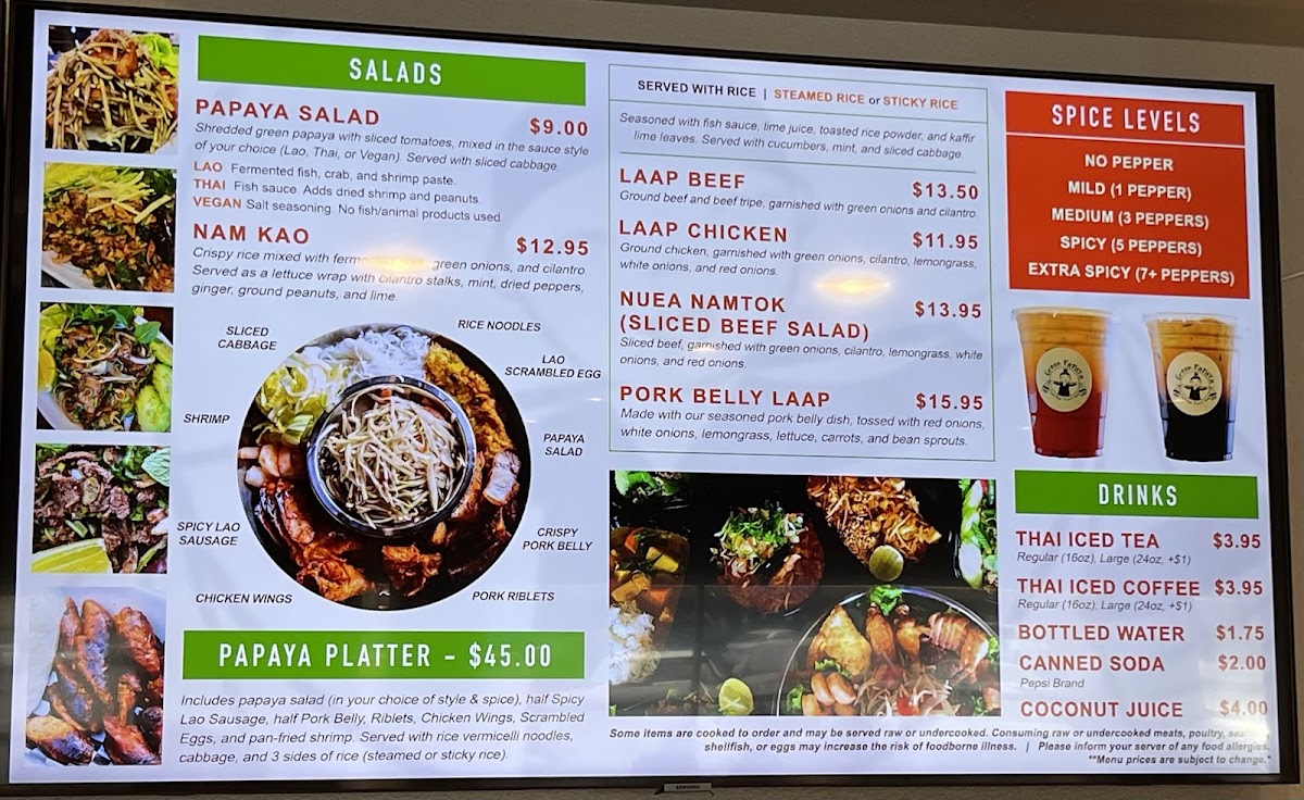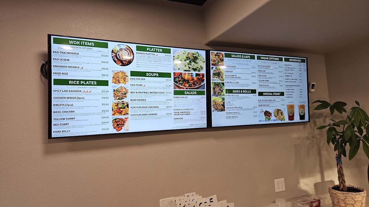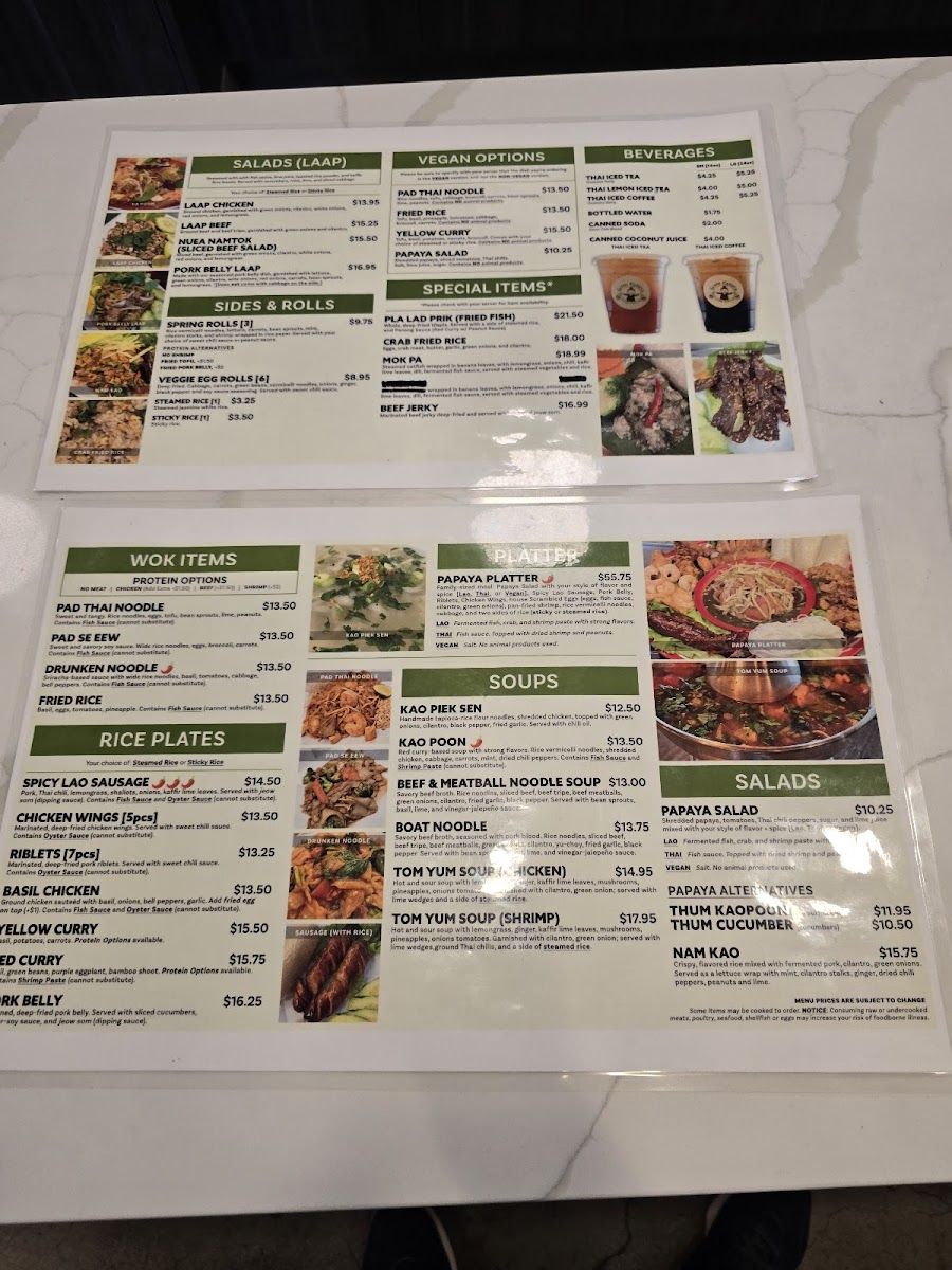This menu serves well for lunch or dinner occasions and accommodates both dine-in and takeout preferences. It offers a broad range of authentic dishes that highlight both Thai and Laotian culinary influences.