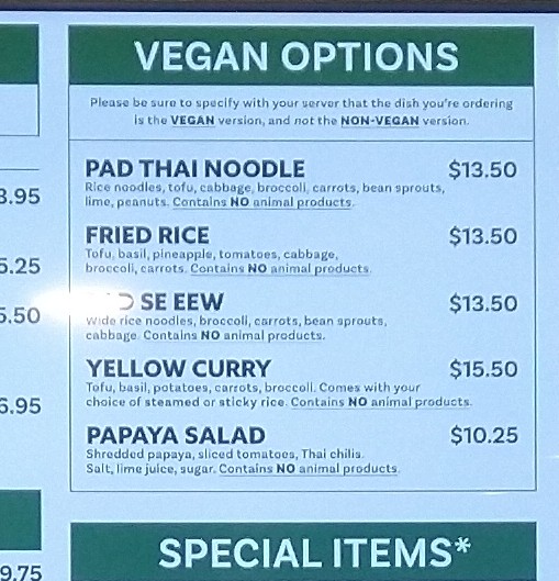 The menu features a selection of Thai and Laotian dishes organized into several main categories, providing a range of options for casual dining or quick meals.